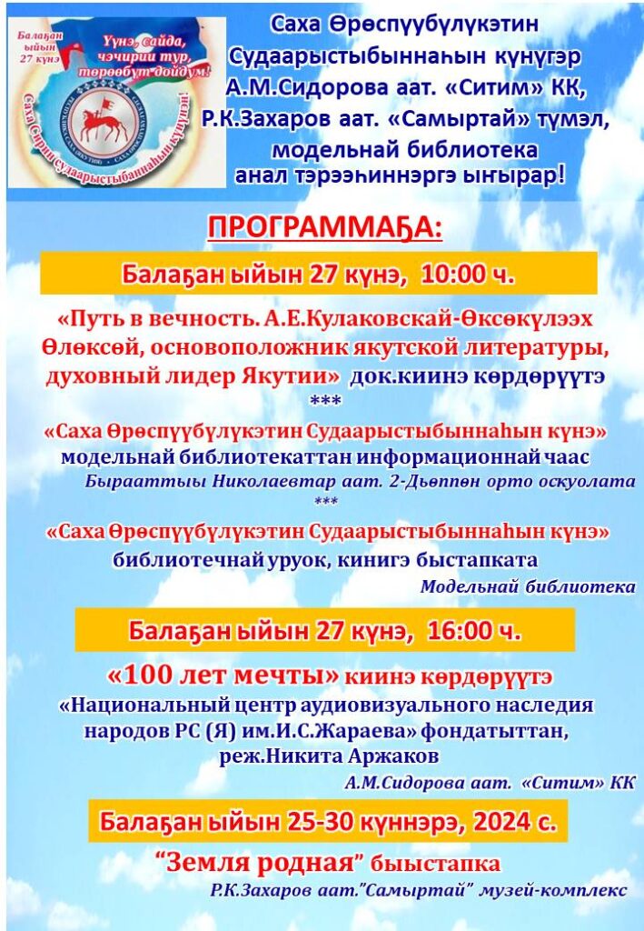 Саха Өрөспүүбүлүкэтин Судаарыстыбыннаһын күнүгэр A.М.Сидорова аат. «Ситим» КК, Р.К.Захаров аат. «Самыртай» түмэл, модельнай библиотека анал тэрээһиннэргэ ыҥырар!